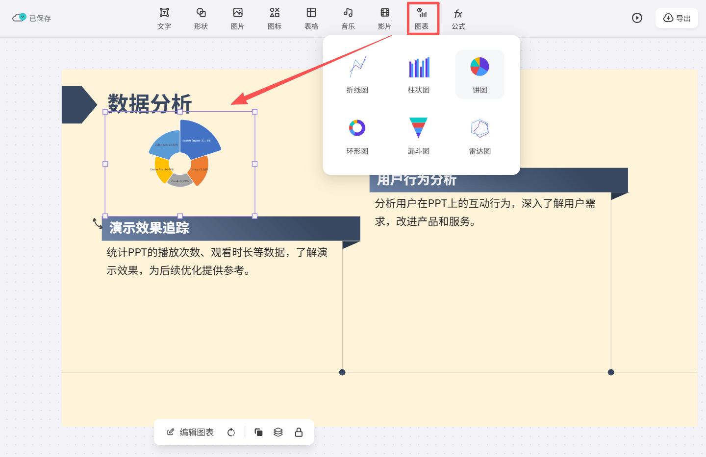 无论是市场分析的数据对比,还是项目进度的占比统计,现在都能在文多多AIPPT编辑页直接搞定!